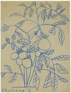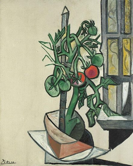 Here are some examples of Picasso’s tomato plant studies from July (the drawings) and August (the paintings). The final painting was created on 7 August, when the city was covered in coppery-grey cloud following an Allied bombing raid on a fuel depot at nearby Saint-Ouen.